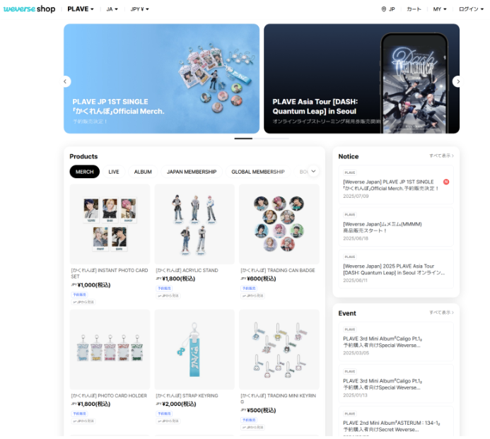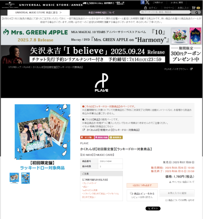 Universal Music Store Annex는 일본 유니버설 뮤직이 운영하는 온라인 숍으로, 플레이브 관련 CD, 싱글, 굿즈 등을 구입할 수 있는 공식 큐레이션 샵이에요. 합계 ¥2,500 이상 구매 시 (일부 제외 지역을 제외하고) 무료 배송이 가능하고, 신용카드 , 편의점, 우편 후불, 케러어 결제 , 대금 상환 등 다양한 결제 수단을 지원하고 있어요. 최근 JP 1st 싱글 ‘かくれんぼ(Hide and Seek)’의 7형태 세트 상품이 예약 판매 중이며, 럭키 드로우로 큰 인기를 끌었답니다. 현재 해상 상품은 품절 상태이지만, 유니버셜 뮤직 스토어 애넥스에 접속하시면, 다양한 플레이브 앨범을 일본 직구 하실 수 있어요. 몰테일 팬덤패스 프로모션 확인하셔서, 일본 직구시 배송비 10% 할인 혜택도 함께 즐기세요