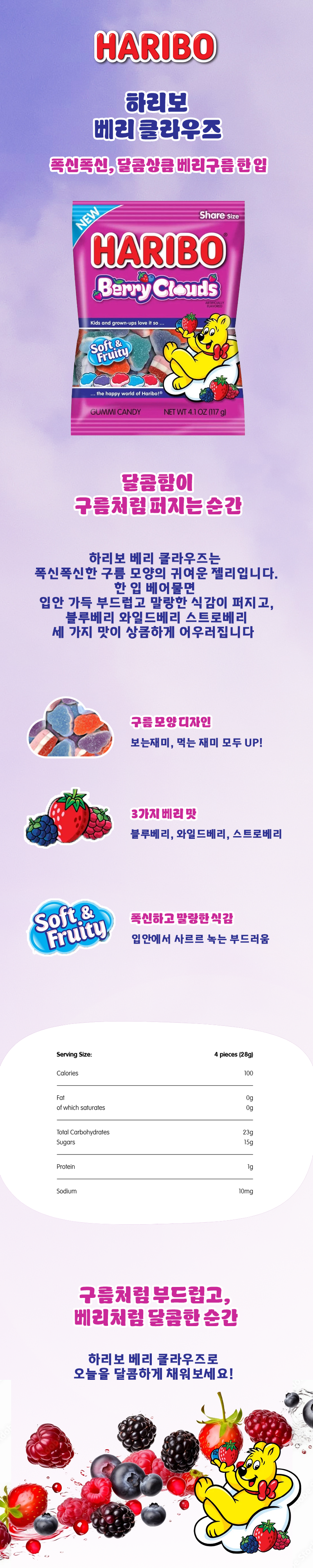 Berry Clouds는 구름처럼 몽환적인 모양으로, 부드럽고 폭신한 식감을 한껏 살린 젤리입니다.