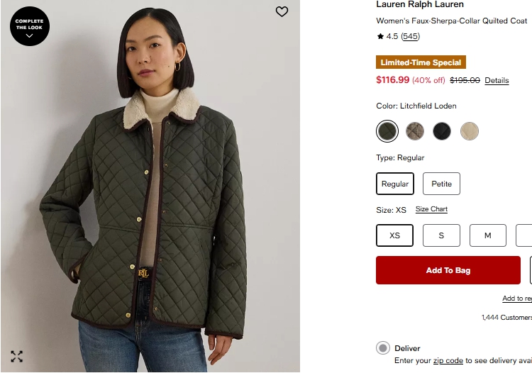 로렌랄프로렌 우먼 인조쉐포라 카라 퀼팅 코트 $116.99