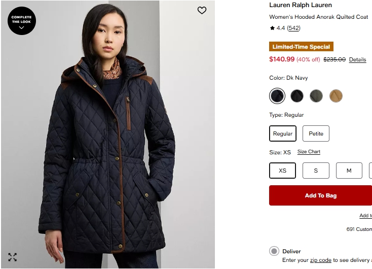 로렌랄프로렌 우먼 후디 아노락 퀼팅 코트 $140.99