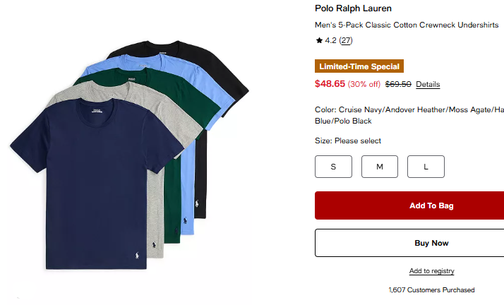 폴로랄프로렌 맨즈 5pk 클래식 코튼 언더셔츠 $48.65
