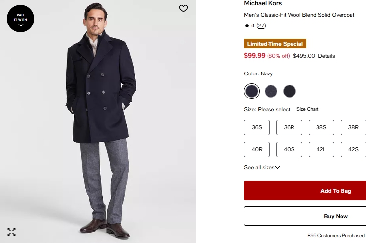 Michael Kors Mens Classic-Fit Wool Blend Solid Overcoat