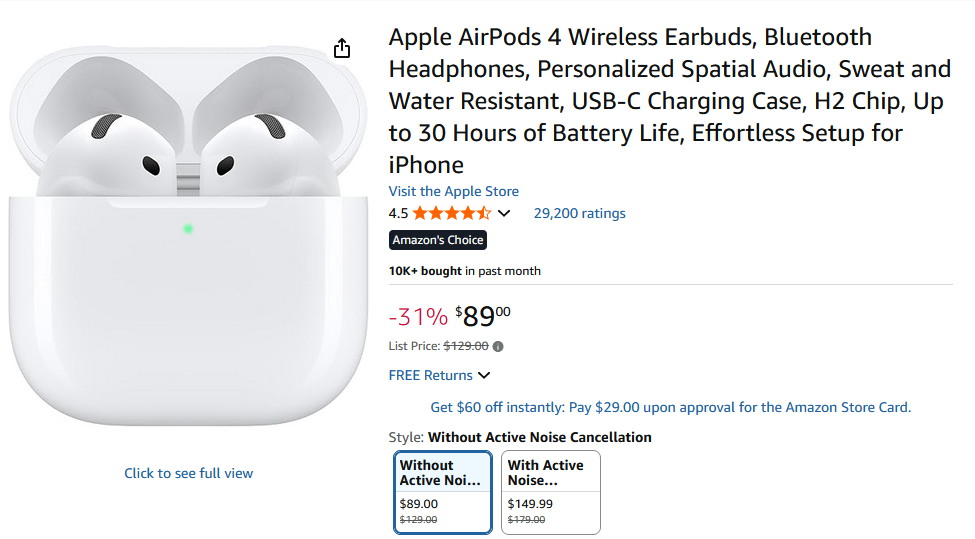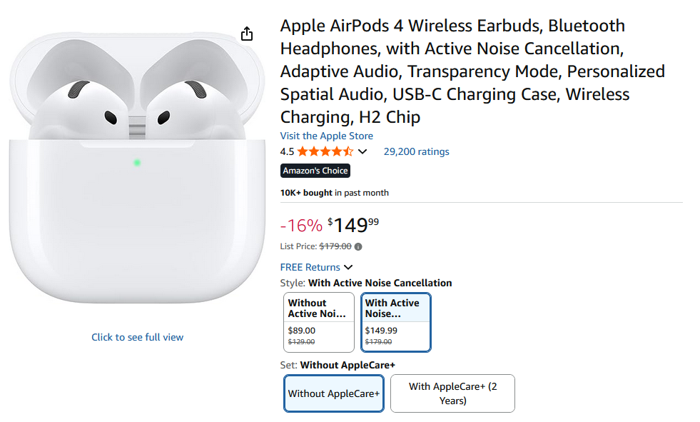 Apple AirPods 4 Wireless Earbuds With Active Noise Cancellation