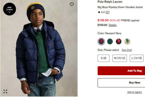 Polo Ralph Lauren Big Boys Ripstop Down Hooded Jacket