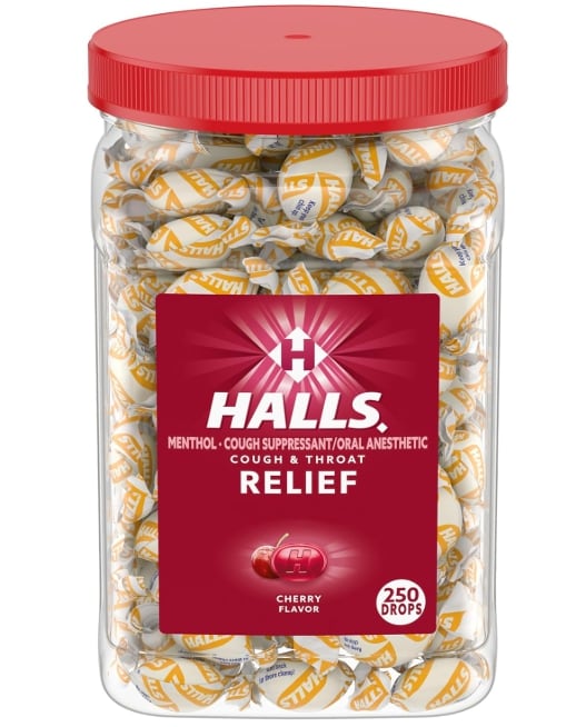 Halls Cough and Throat Relief Cherry Cough Drops, Bulk Pack, 250 Drops
