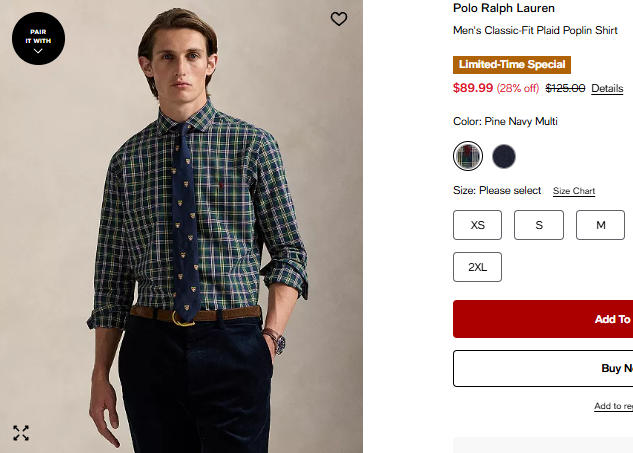 폴로랄프로렌 맨즈 클래식핏 플레이드 포플린 셔츠 $89.99