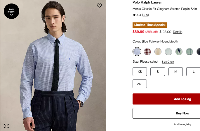폴로랄프로렌 맨즈 클래식핏 깅엄 스트레치 포플린 셔츠 $89.99