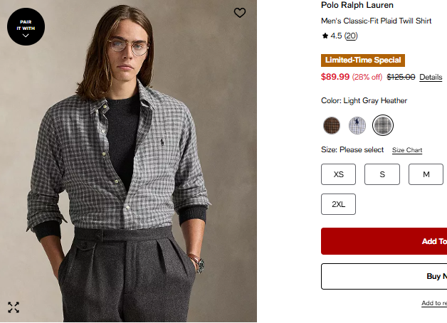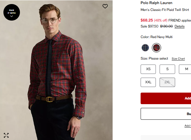 폴로랄플렌 맨즈 클래식핏 플레이드 트윌셔츠 $68.25
