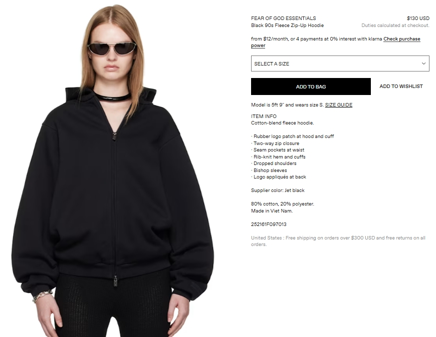 피어갓에센셜 90's 프리스 집업 후디 $130
