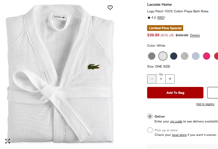Lacoste Home Logo Patch 100% Cotton Pique Bath Robe