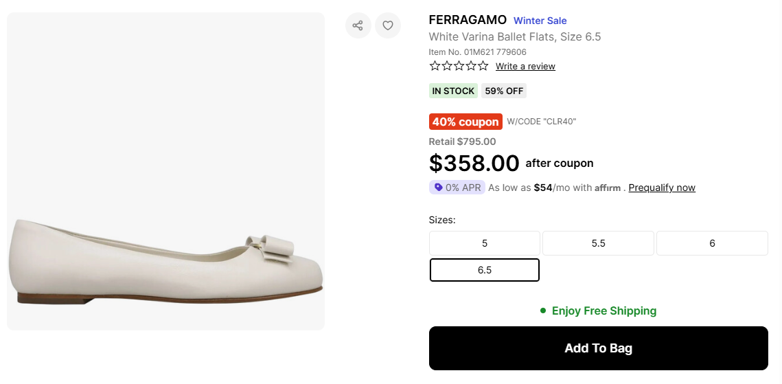 Ferragamo White Varina Ballet Flats, Size 6.5